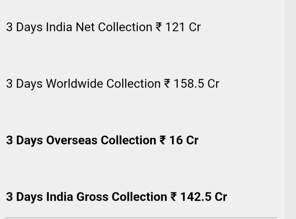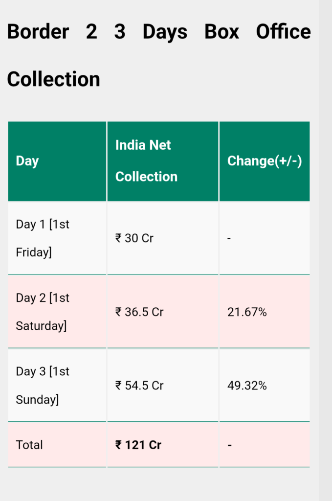 वहीं अगर बात करें बार्डर 2 के तिनों दिन का सम्पूर्ण कमाई कि तो बार्डर 2 भारत से तिन दिन में 121 करोड़ का कमाई किया है। जबकि इसका तिन दिन में वार्ड-वाइड से कमाई 158.5 करोड़ का हुआ है। और ऐ कमाई इसके क्रेज के हिसाब से जबरदस्त है।